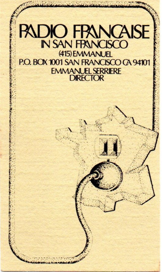 There was already another one-hour radio program produced by Alain Efron on Sundays 6:30PM out of KBRG FM San Francisco (Alain stopped about 3 months after I started mine on KQED). He was playing French rock.