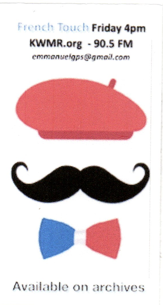 The current "The French Touch" on KWMR, 90.5 Point Reyes Station and KWMR.org started in December 2015 after five training sessions covering the sations' mission, values and missions as well hands on the mixing board and various players, conducted by the Program Manager at that time, Lyons Filmer. Because of the internet, I have listeners all over the world with frequent contact with listeners in France, Spain, Australia, Oklahoma, etc. The show is first broadcast on Fridays at 4p.m. Pacific Time, with a repeat at 9a.m. Paris Time on Wednesday. It is always available for two weeks on archives by clicking on my mustache on the HOME page of this website.