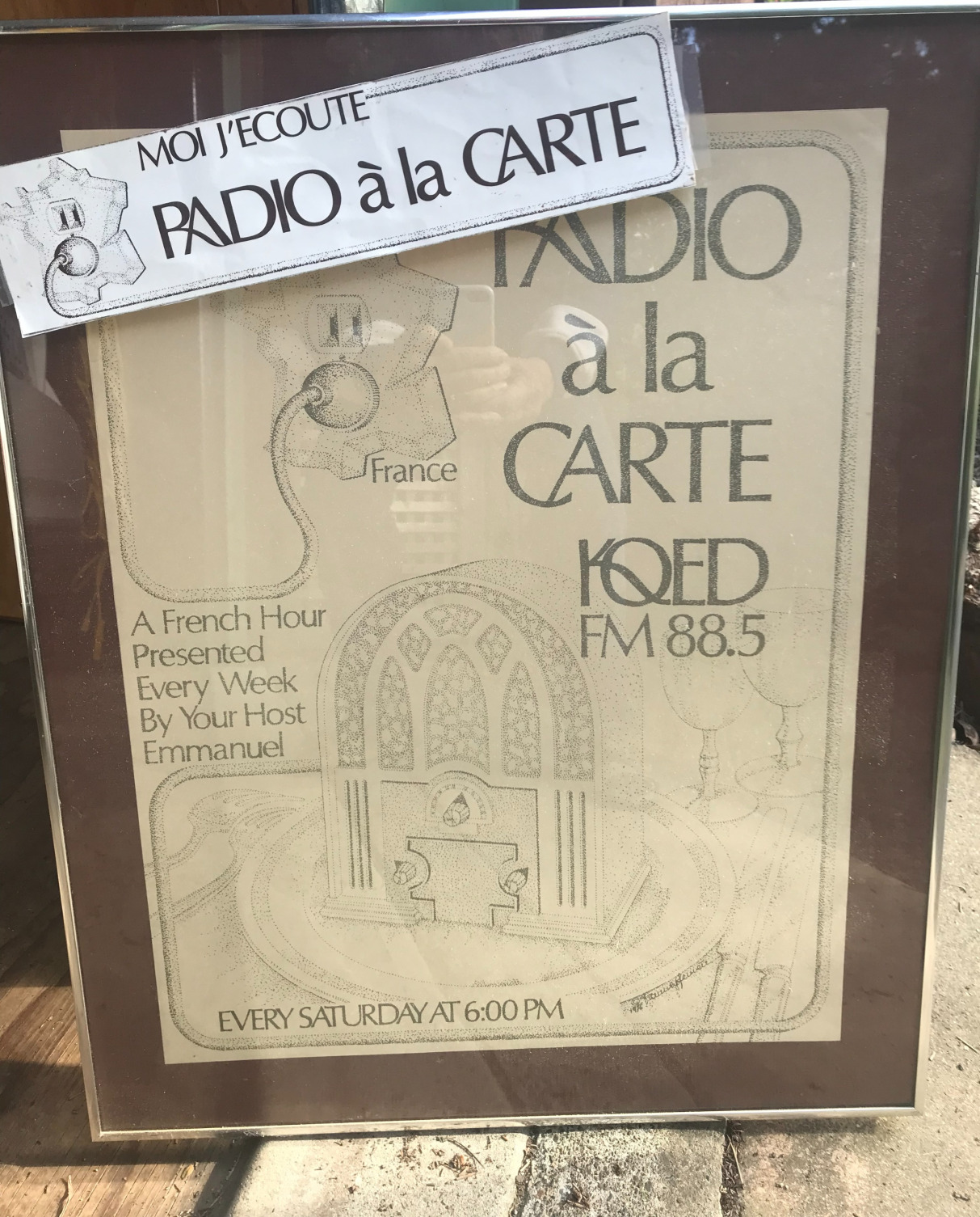 On May 12, 1976, I negotiated a spot on KQED 88.5 FM for Wednesday night at first and then moved to Saturday afternoon, at 4:30pm at first then at 6pm soon after. The three major players in this new venture (besides my wife-to-be that I met at the French Consulate while looking for material to be broadcast) were KQED FM Music Producer and Program Director Gene Parrish, the French Consul Adjoint Bertrand Rault and the producer and engineer Sedge Thompson who was at the console behind the glass rolling the  tapes and spinning the records. It was said at the time that my shows had a potential of 40,000 listeners in a 50 miles radius. Later on, I was told by KQED that I had an audience of about 8,000 people listening to at least 10 minutes to the show, mainly due to the fact that my show was following a very popular program "All things considered".